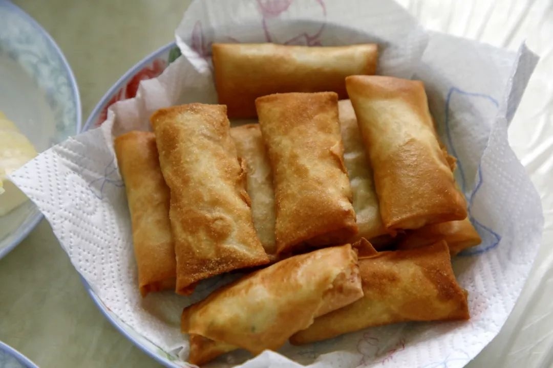 将炒制好的馅料晾凉后,取出一张春卷皮铺平,取适量的馅料放在春卷皮的一边,将春卷皮的一角盖住馅料卷起来,再将旁边两边往里折,一直往下卷成筒状,再在收口处沾上清水粘住即可。包好春卷后,炸春卷也是个技术活。“要热锅下油,油温不能高也不能低。油温太低,油就会进入春卷内,油温过高,春卷皮比较薄,容易炸焦。”俞丽芳介绍起她的小绝招,待春卷稍稍定型后,用筷子不停翻面使两面受热均匀,炸至金黄后即可出锅。