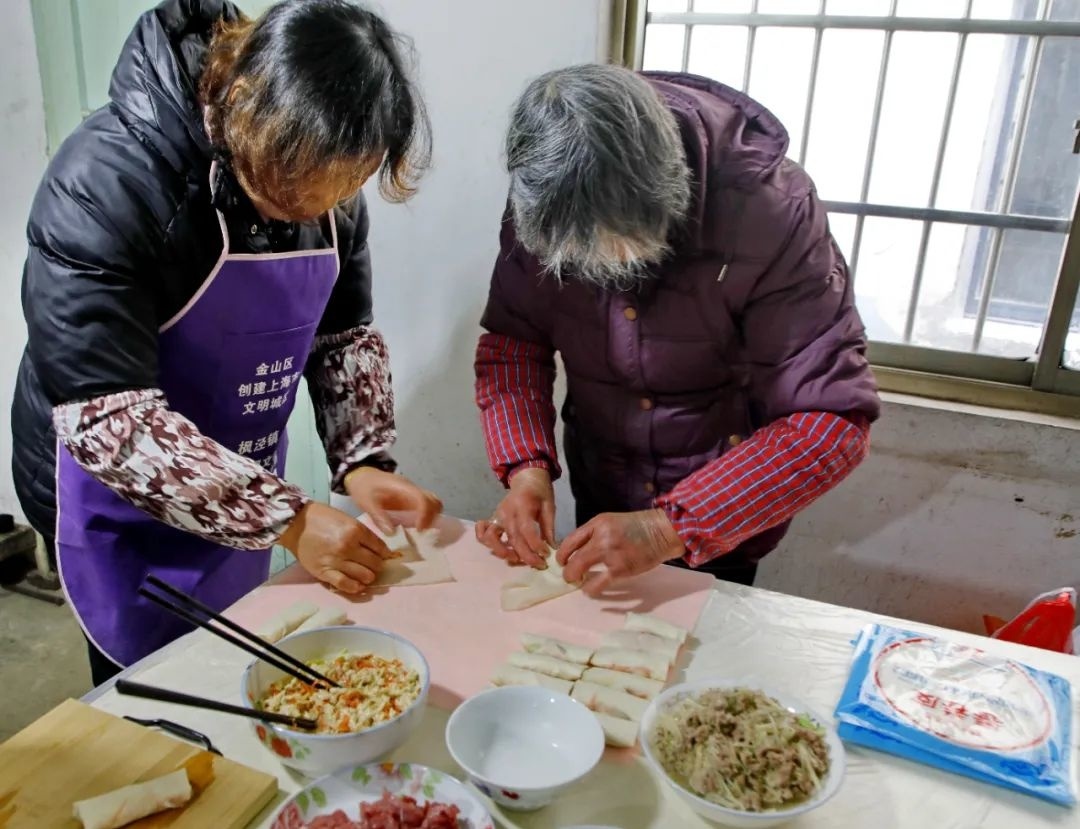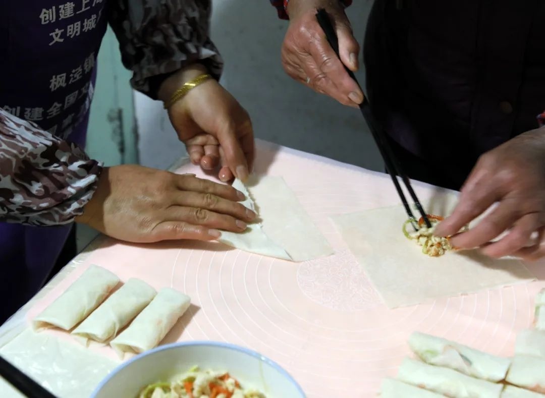 中洪村村民俞丽芳一早便开始制作炸春卷了。炸春卷制作讲究色香味俱全,分“调馅”“包馅”“油炸”三个步骤,能否制作出酥脆的美食,每一步都是关键。