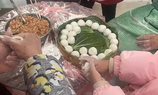 搓粉、揉面、和馅……一大清早,八字桥村的热心志愿者和村民们聚在一起,忙碌地进行着蒸汤圆的准备工作。取一小块糯米团捏成窝形,包入已经调制好的鲜肉冬笋,收好口做成汤圆生坯,再轻轻放入铺满青菜叶的蒸屉中,不到十分钟的时间,满满的一屉汤圆诞生了。“吃上一口‘圆团’,寓意团圆。”村民江红花告诉记者,汤圆在松江话中被叫做“圆团”,有咸有甜,馅料可以根据个人喜好,加入雪菜、冬笋等,颜色不仅有白色还有绿色。