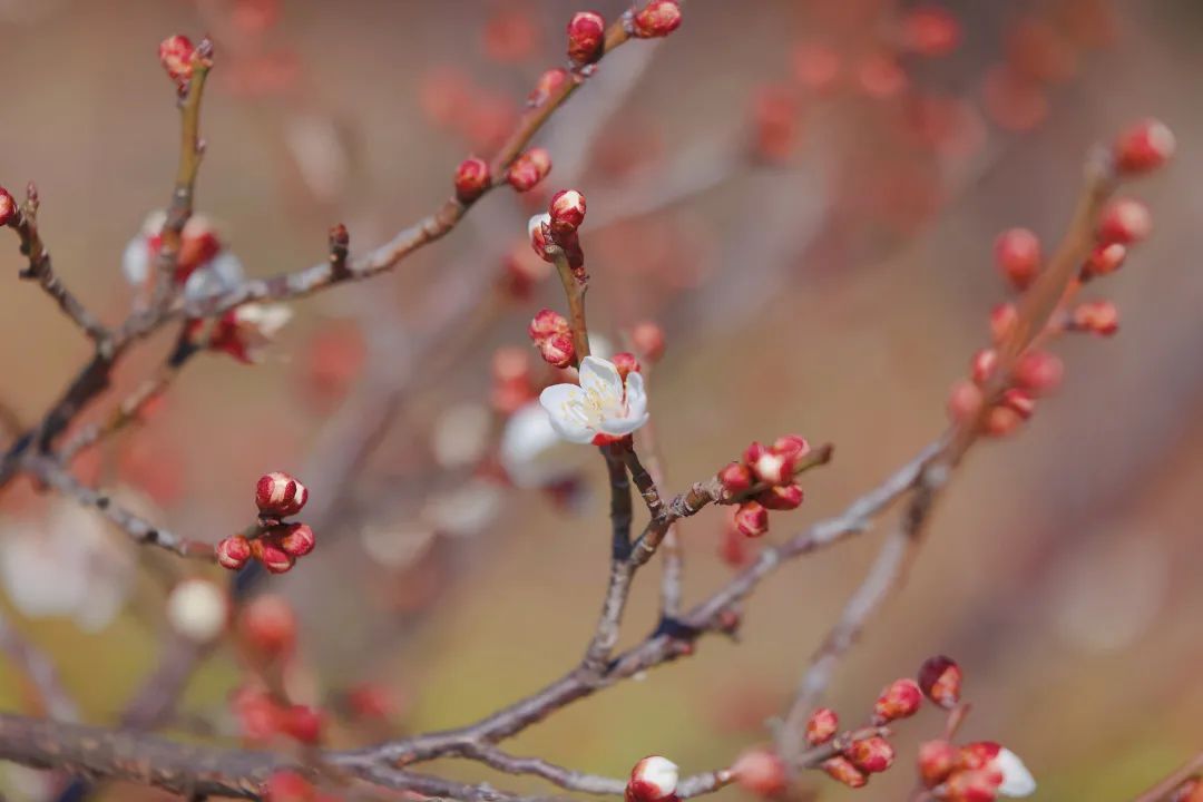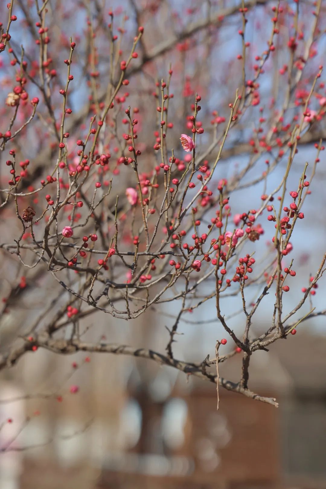 在顾村公园梅樱林,梅树枝头缀满了圆鼓鼓的花苞,有的还含羞半露,有的已冲寒而开完全盛放。