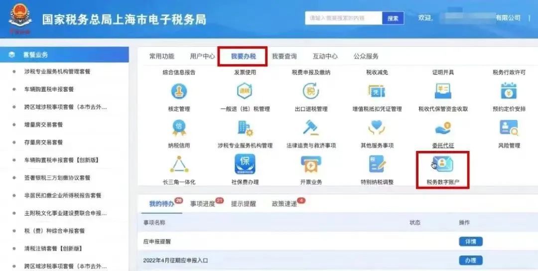1.数字化电子发票试点纳税人,登录【上海市电子税务局】,点击【我要办税】——【税务数字账户】,进去【电子发票服务平台】;