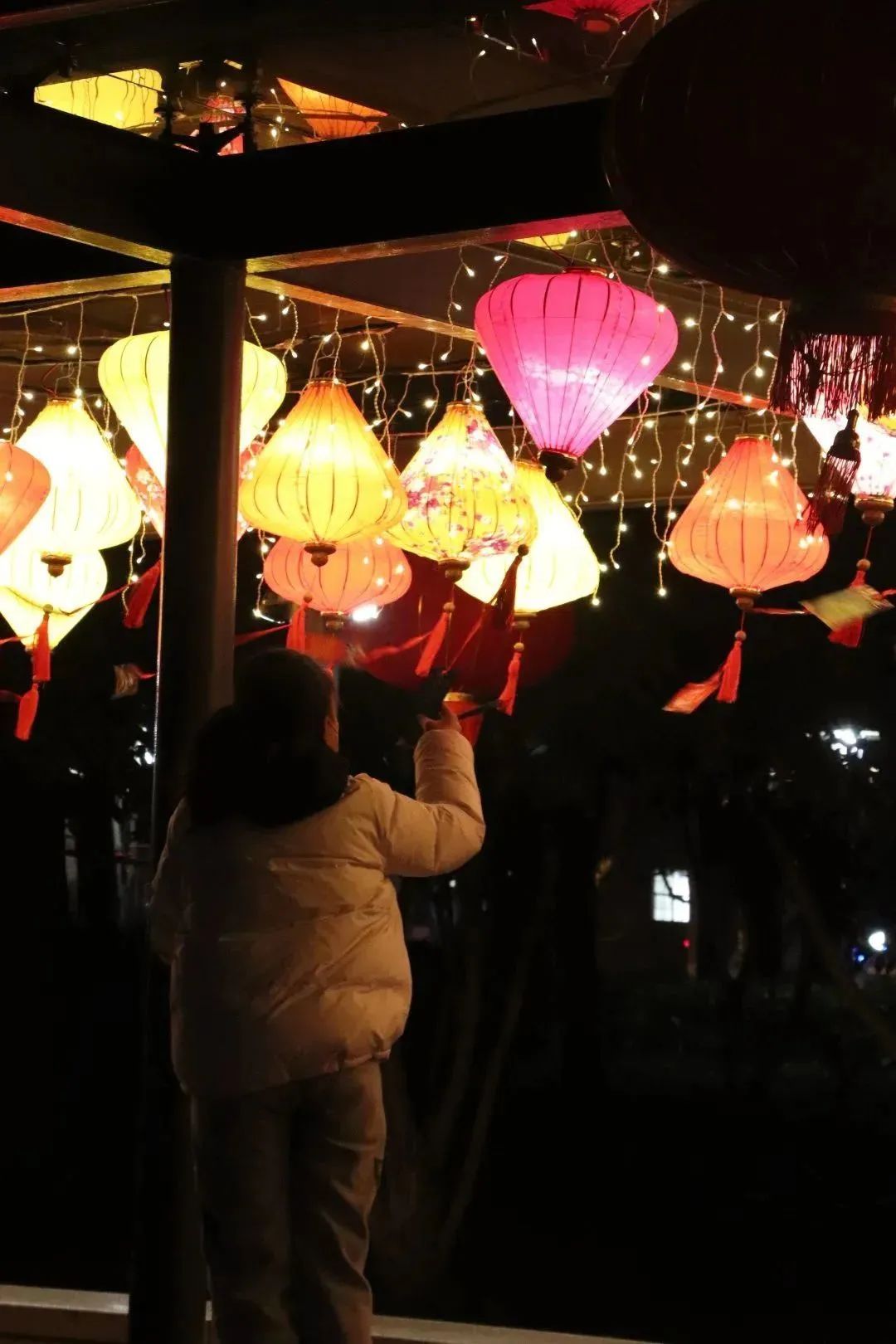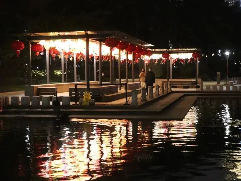 火树银花合,星桥铁锁开。夜晚,中式复古彩灯与景观灯亭和汇金湖水遥相呼映,熠熠生辉,打造出了璀璨夺目的灯光通道,游客穿行其中,犹如置身灯海,营造出雅致又喜庆的节日氛围。