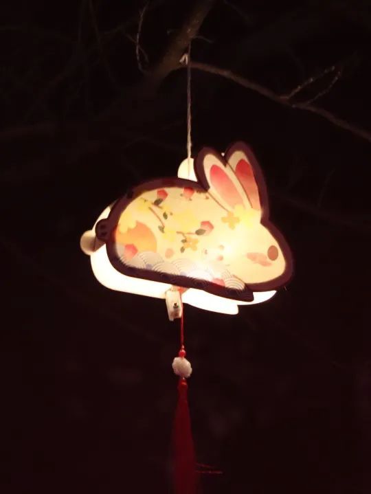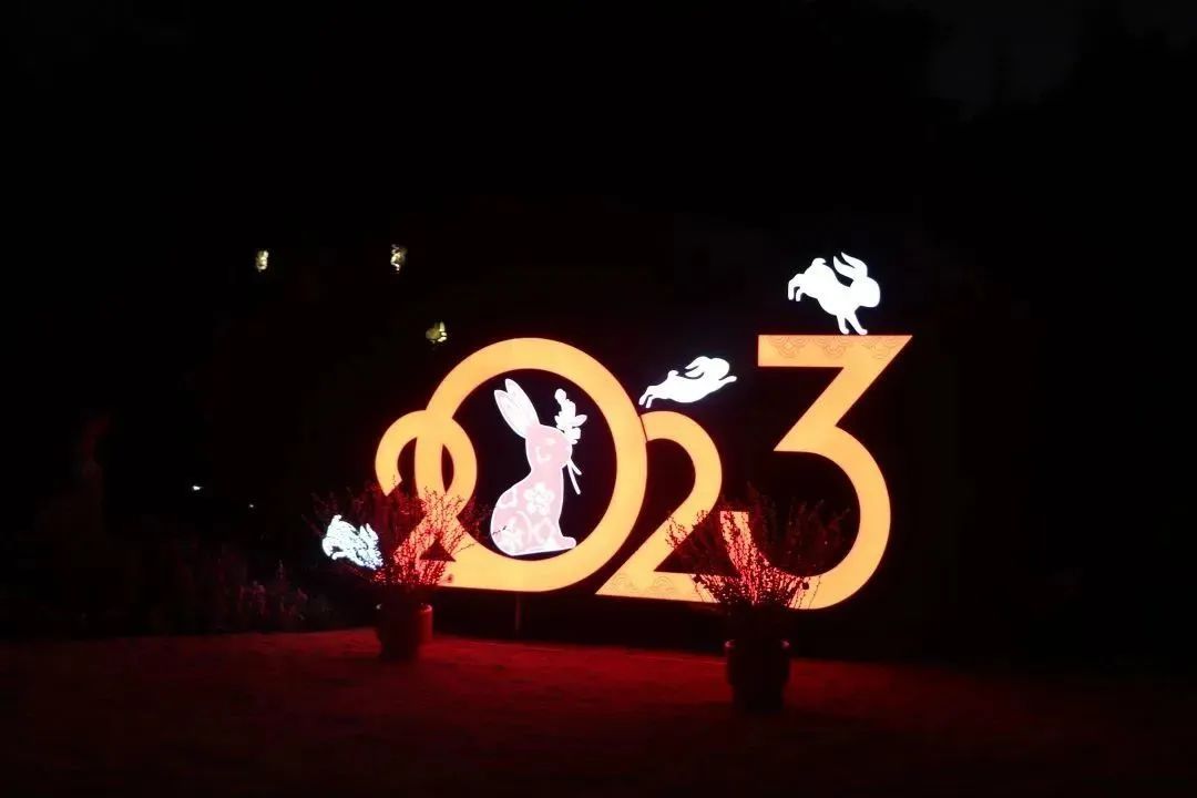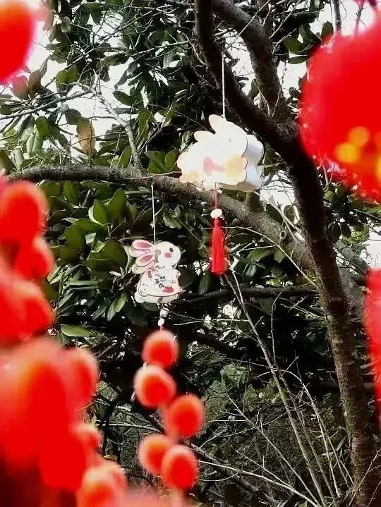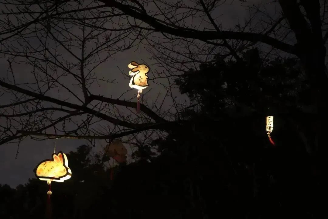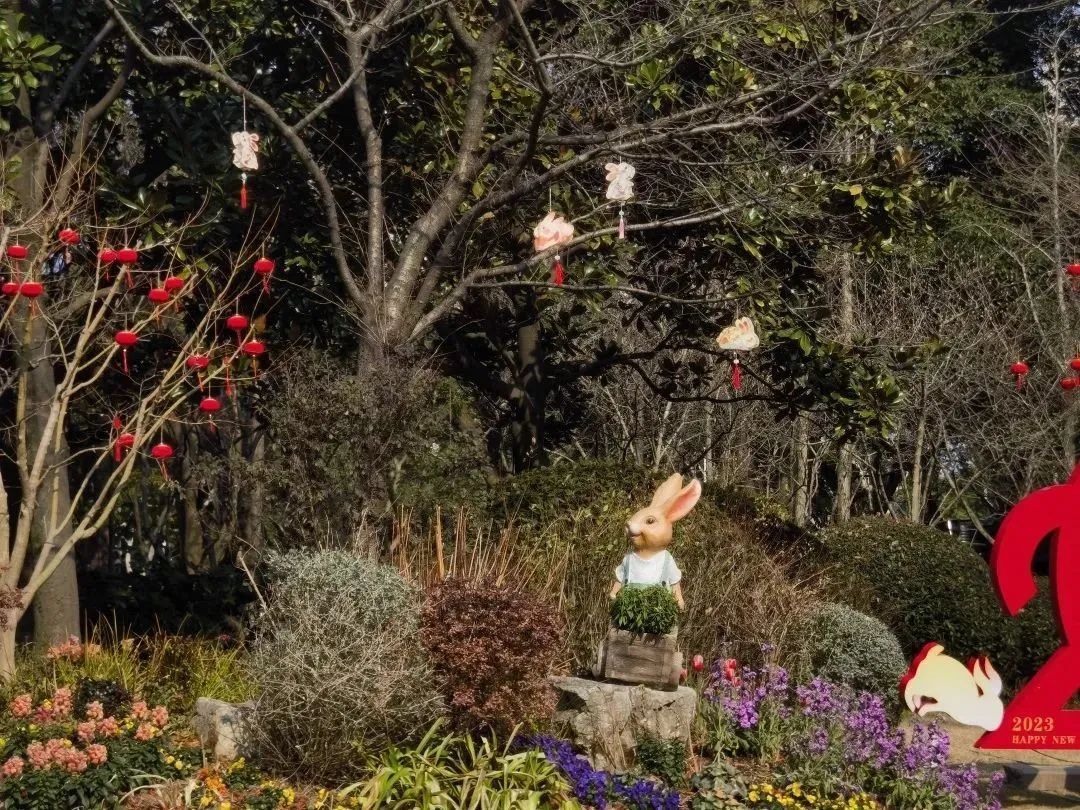 花坛花镜处悬挂着生动活泼、形态各异的兔子灯,仿佛在枝头欢快地跳跃,花丛中的小兔子立雕憨态可掬、妙趣横生,为兔年元宵的到来增添了浓厚的节日气氛。