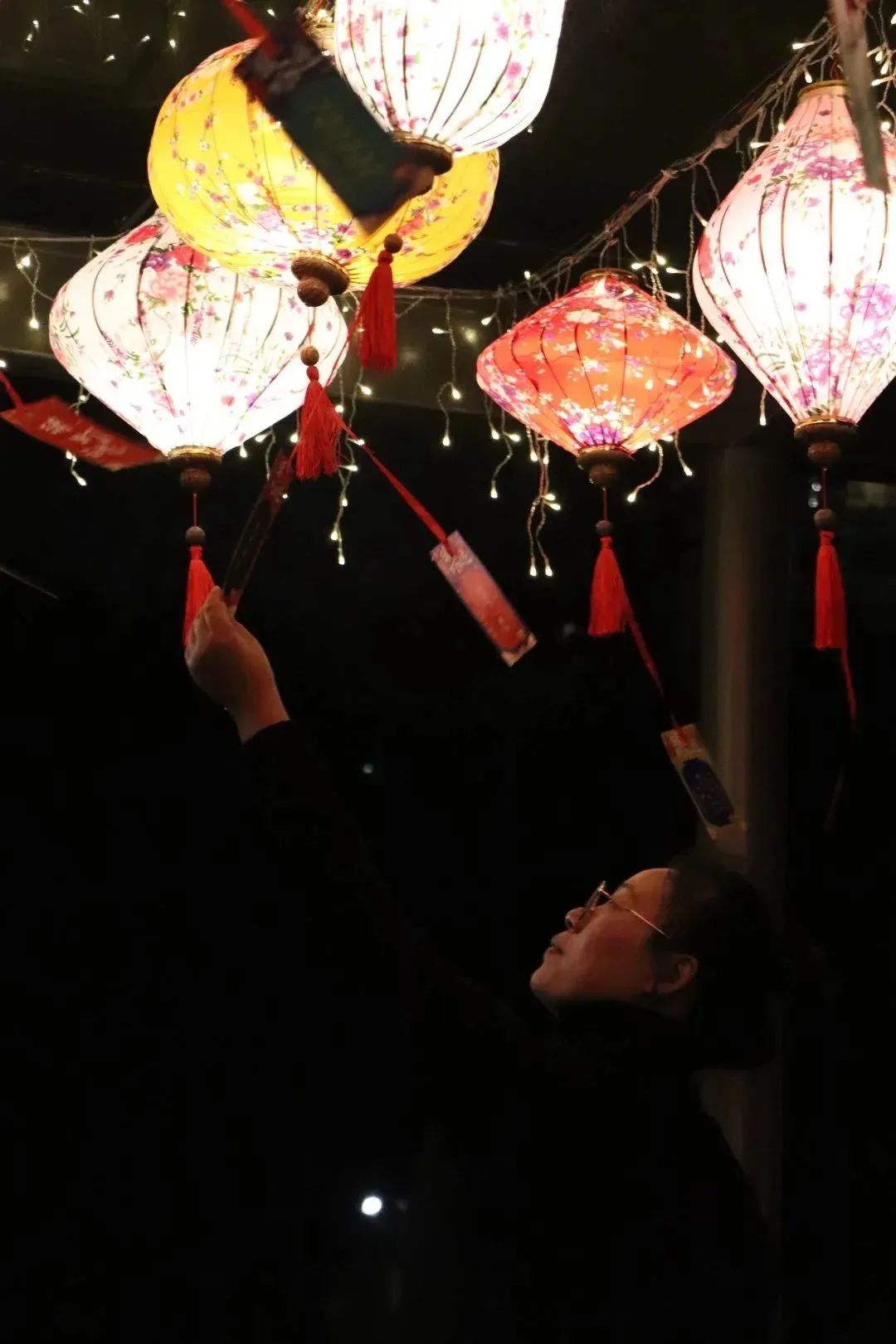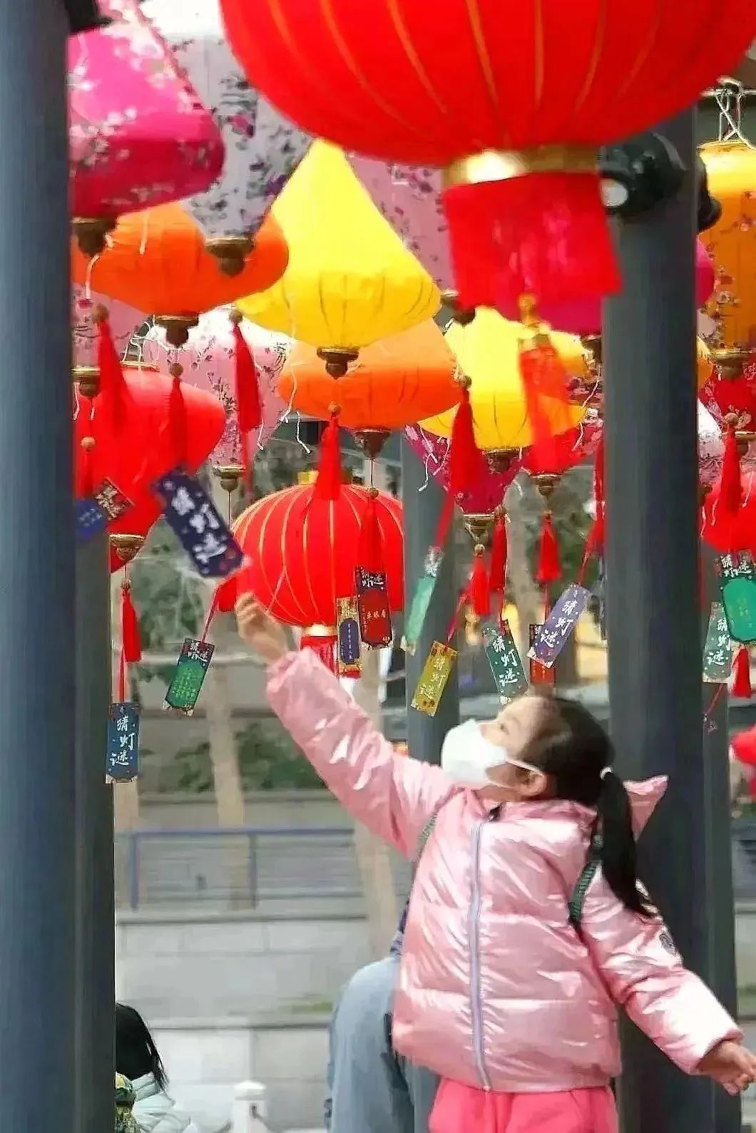 徐家汇公园汇金湖畔,一盏盏造型精美的宫灯上描绘着樱花、梅花等多种花卉,宫灯灯尾处悬挂的趣味灯谜引来不少大小朋友驻足思考。“今天带着孩子来公园看花灯,猜灯谜,希望兔年全家喜乐安康。”张阿姨看着孩子欢快的背影乐呵呵地说道。
