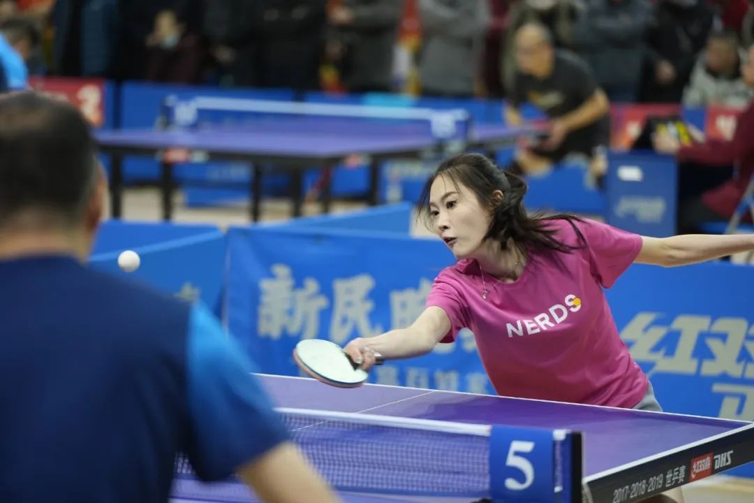 本次比赛正值立春和元宵佳节,比赛时间契合了“迎新春”的赛事主题,也为全市乒乓球爱好者营造了阖家团圆的喜庆氛围。比赛当日,卢湾体育馆内红灯笼高挂,礼炮声鸣响,迎接着各路来宾。参赛选手中,有夫妻、子女的家庭组合,有年龄为十岁上下的少儿战队,也有常年坚持一起健身的乒乓球友们,每个人的脸上都洋溢着节日的欢乐。