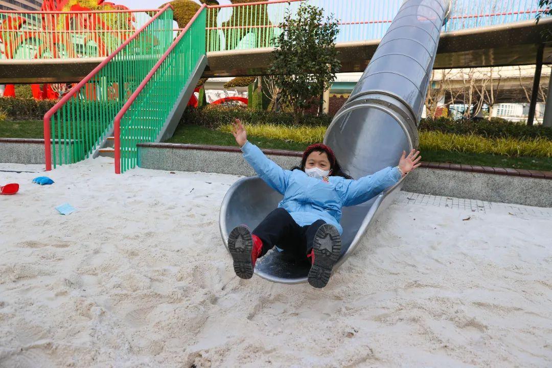 “我们十二点多就来了,玩了一个多小时啦。”“这个滑滑梯有点高,但是我觉得很刺激。”连接两层的滑梯略有高度,适合喜欢冒险的孩子王;柔软的沙坑、毛毛虫滑梯、星球攀岩都让孩子们觉得乐趣十足。