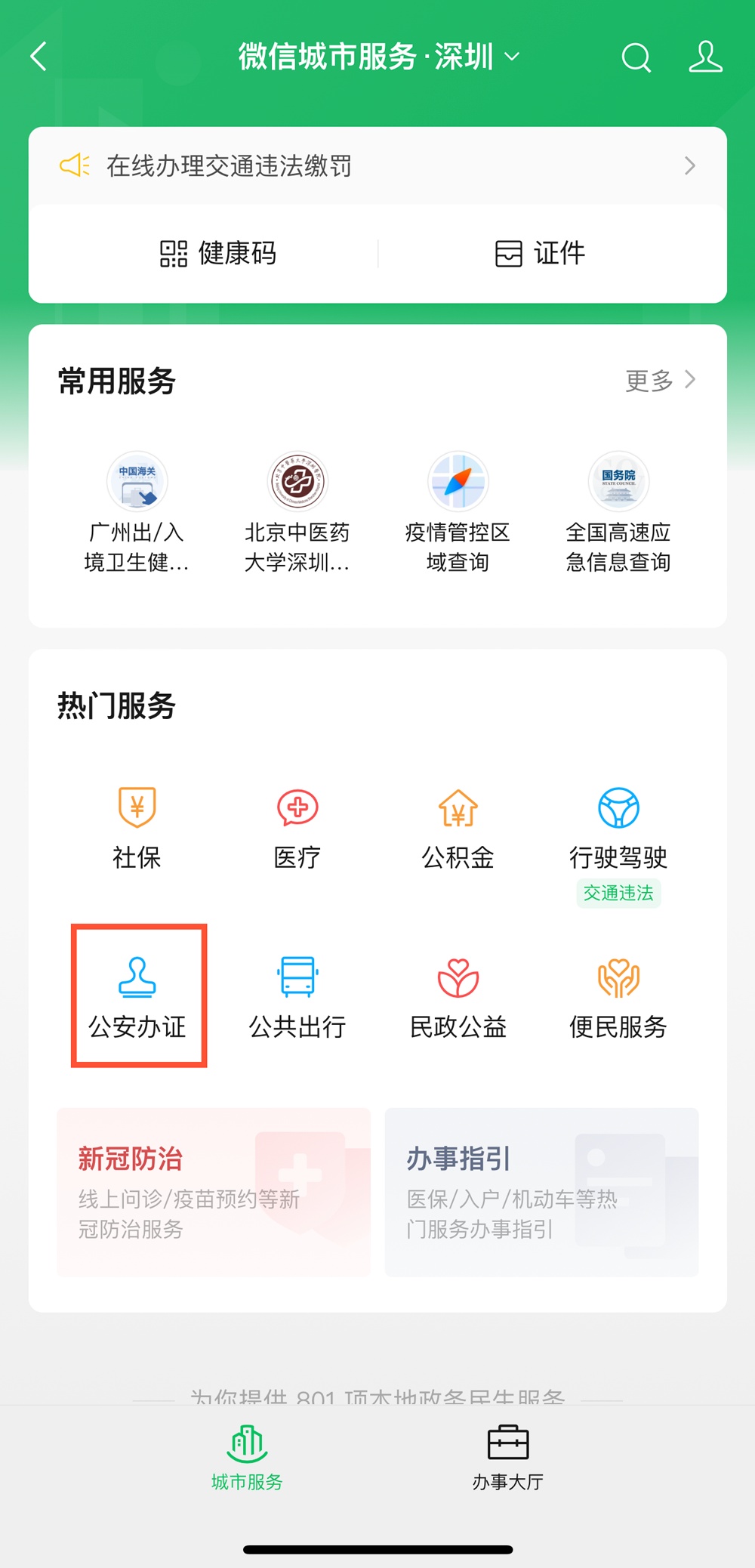 在微信中依次点击“我-服务”进入“城市服务”,选择“公安办证”即可进入你当地的官方出入境小程序,选择“出入境业务预约”办理业务。