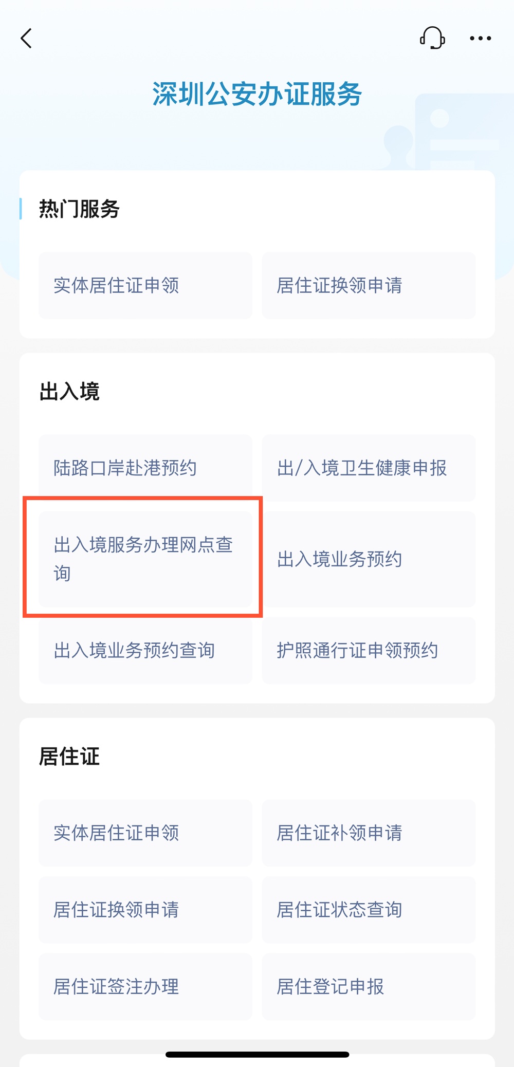 在“城市服务-公安办证”页面,点击“出入境服务办理网点查询”,即可按照所在地区选择办事网点。