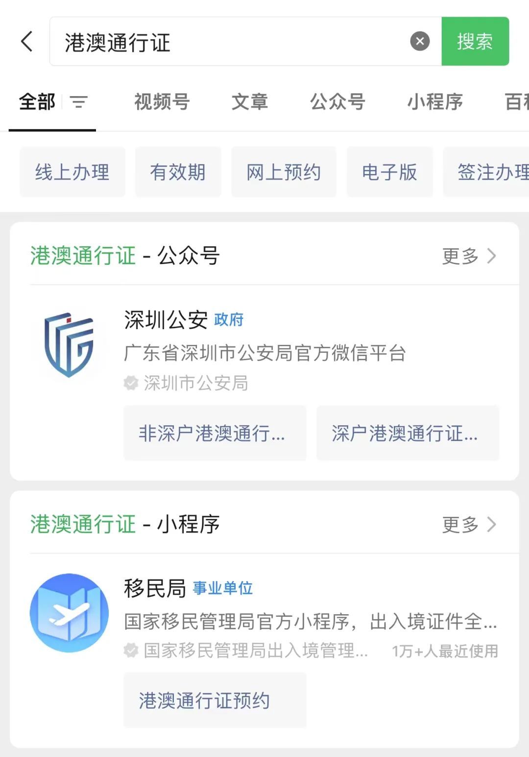此外,微信搜一搜“港澳通行证”,也可以一键进入你所在地的官方小程序,办理业务预约、查询等业务。