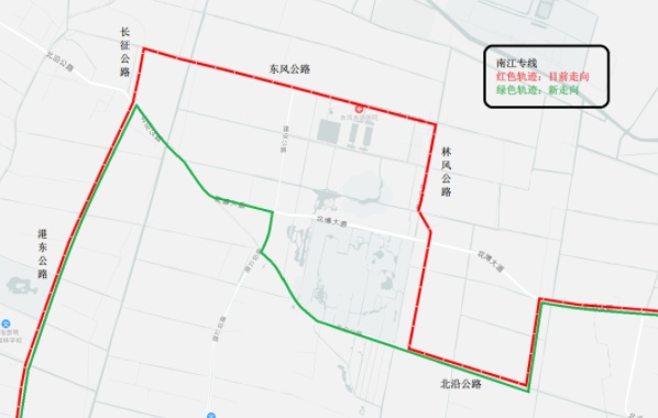 调整后走向:南门汽车站起经南门路、东门路、育麟桥路、湄洲路、高岛路、鼓浪屿路、港东公路、北沿公路、花博大道、建设公路、北沿公路、东冉路、平悦路至长江农场(双向)。