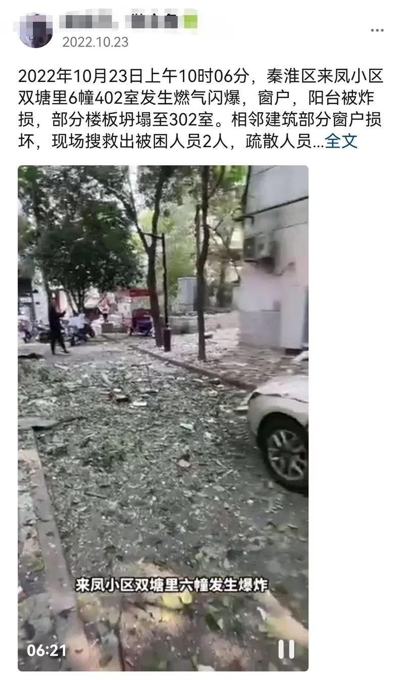 近日,网上有传言称:“2022年10月23日上午10时06分,南京市秦淮区来凤小区双塘里6幢402室发生燃气闪爆,窗户、阳台被炸损,部分楼板坍塌至302室。相邻建筑部分窗户损坏,现场搜救出被困人员2人,疏散人员23人,一人轻微伤。”“该事故原因是做饭时手机放在炉具前,手机先爆炸,随后发生天然气爆炸。”同时配有图片和短视频。这是真的吗?