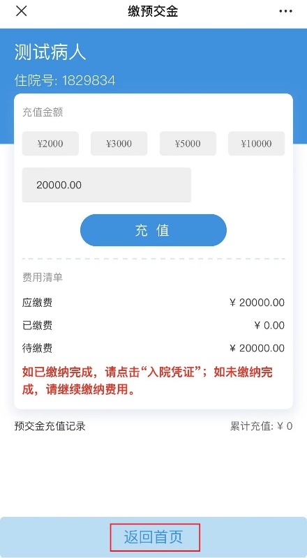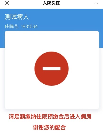 友情提示:若点击“入院凭证”出现以下界面,则说明住院预交金未缴足,请返回住院服务页面点击“缴预交金”补足后方可进入病区。