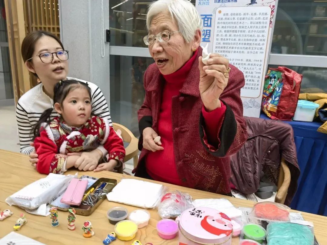 集市上,还设立了一条非遗活动长廊,集结了风筝绘制、面塑、剪纸、漆艺和布艺贴画五项非遗。来自上海工艺美术研究所的非遗传承大师赵子平、赵凤林夫妇齐上阵,一个教剪纸,一个教面塑,被兴奋的孩子们团团围住。