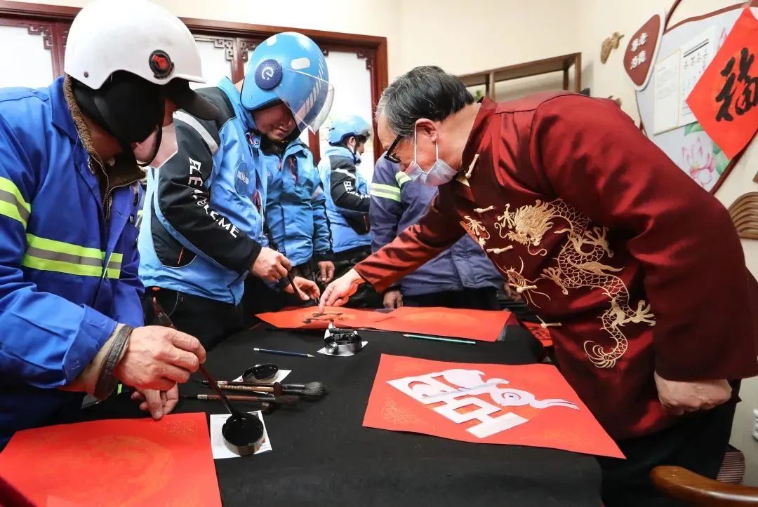 “恭祝大家新的一年吃得满足,笑口常开!”饿了么外卖小哥李衷雄,云南人,自从干了这行,年年春节都是在上海过的。2月2日下午,在交通银行鞍山路支行的爱心驿站内,他写了一张“福”字,打算回去贴在家门口。他说,这一抹抹红色,让他感受到上海这座城别样的温暖。“对我来说,上海一直很亲切。每次在路上找不到方向时,边上的叔叔阿姨都会为我指路,非常热情。今天社区和银行又组织我们一起参与活动,热热闹闹,特别开心。”
