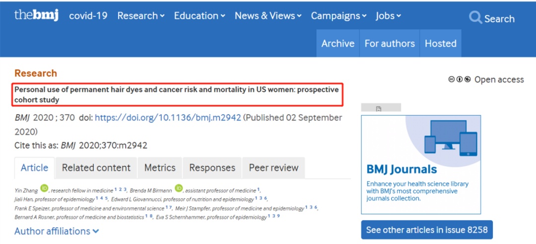 这篇文章针对12万名研究者长达36年的随访研究表明,个人使用永久染发剂与大多数癌症发病风险和癌症相关死亡风险之间未见显著相关性。研究中提到,哪怕是36年间染发次数超过200次的被随访者,也没有发现使用染发剂直接诱发癌症的证据。