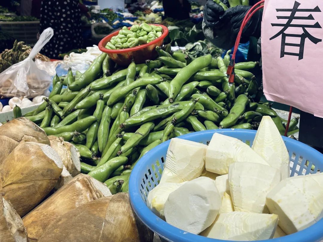 “每个人进来都会买点蚕豆、竹笋,这两个菜是当季必吃的。”曹女士摊位专卖时令菜,目前春笋20元一斤,竹笋23元一斤,蚕豆8元一斤,都很受欢迎。
