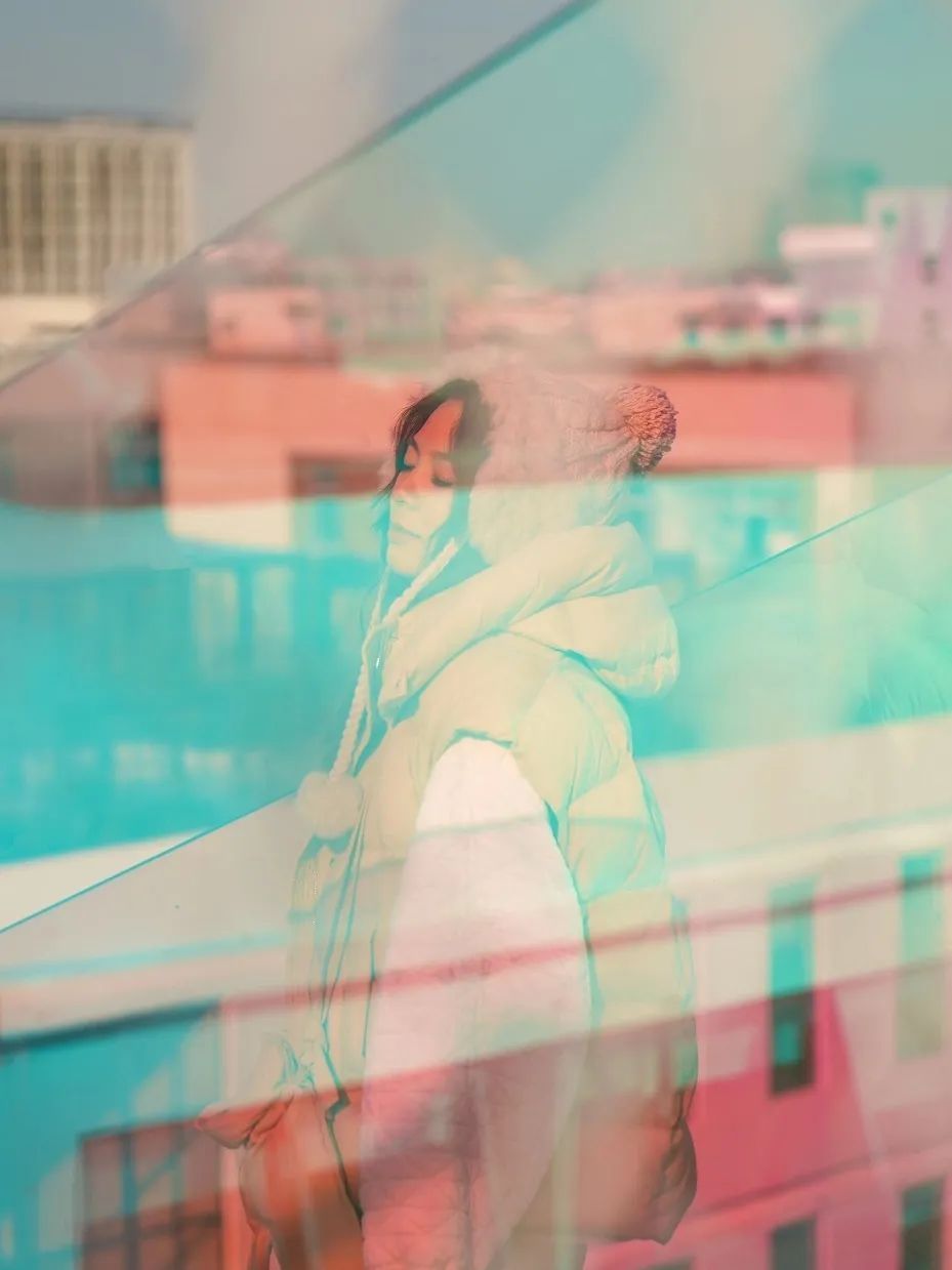 人物站在楼梯上方,取景时站在5号楼天台,楼梯左侧,透过玻璃拍人物侧面,玻璃折射出的彩虹七色映照在侧脸上,极具朦胧之感,十分梦幻。