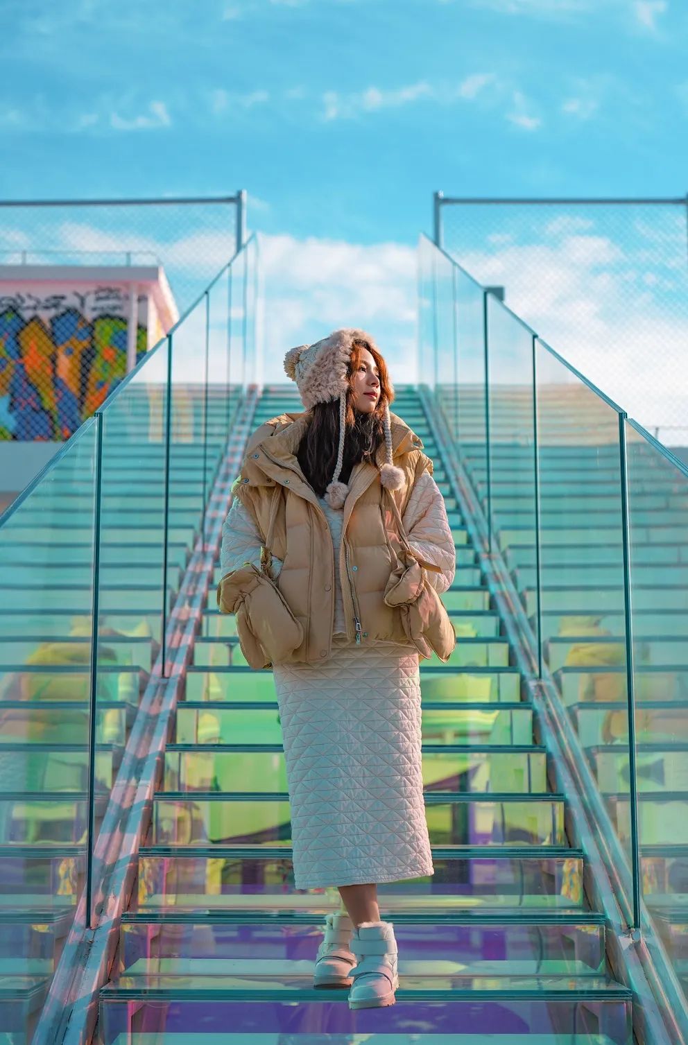无论在园区哪个角度,彩虹天梯都让人第一眼就惊艳,绝对是打卡首选。人物站在楼梯下方,取景时把人物置于画面中间,从下往上带一点仰拍角度,以蓝天为背景,“咔嚓”一声就很好看。