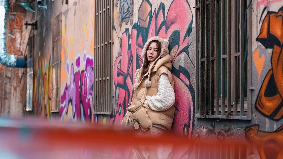 除了熊猫涂鸦,还有用色十分大胆的创意涂鸦墙。涂鸦作品,直接画于原老旧墙面上,还有老式的窗户,镜头拉远、前景虚化,这才有了工业厂房改造后独有的历史厚重感。