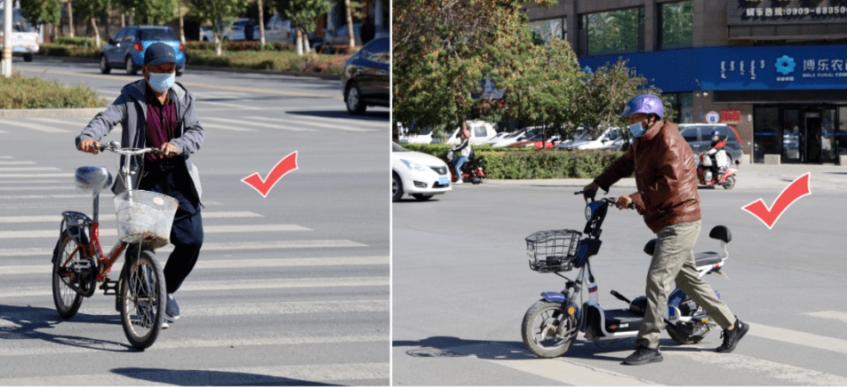 因此,骑电动车过马路正确的“姿势”应该是:下车推行,边走边看,慢慢通过!