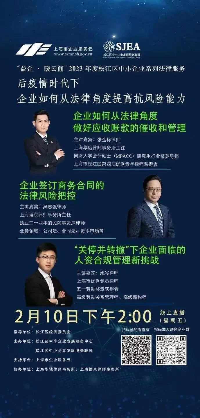 为了帮助企业更好地建立危机预防和应对能力,防范各项法律风险,在松江区经济委员会的指导下,及“上海市企业服务云”平台的支持下,松江区中小企业发展服务中心、松江区中小企业发展服务联盟携手联盟内的律师事务所于本周五(2023年2月10日)下午14:00-16:30举办主题为“后疫情时代下,企业如何从法律角度提高抗风险能力”的线上法律直播活动。