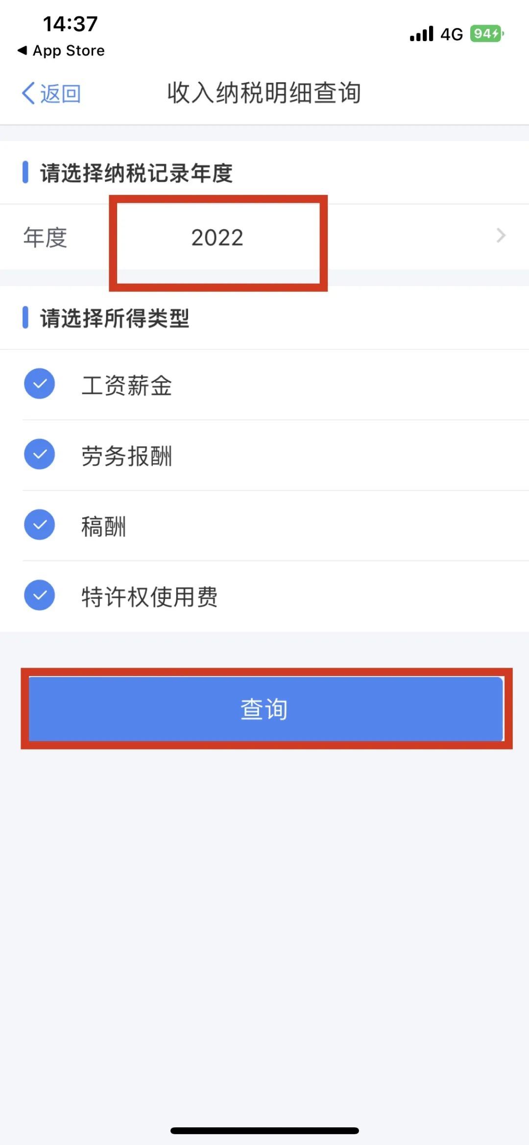 进入收入纳税明细查询页面,选择“纳税记录年度”和“所得类型”,点击【查询】查看收入纳税明细。
