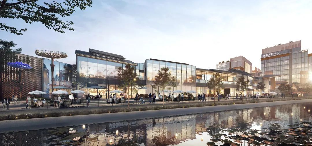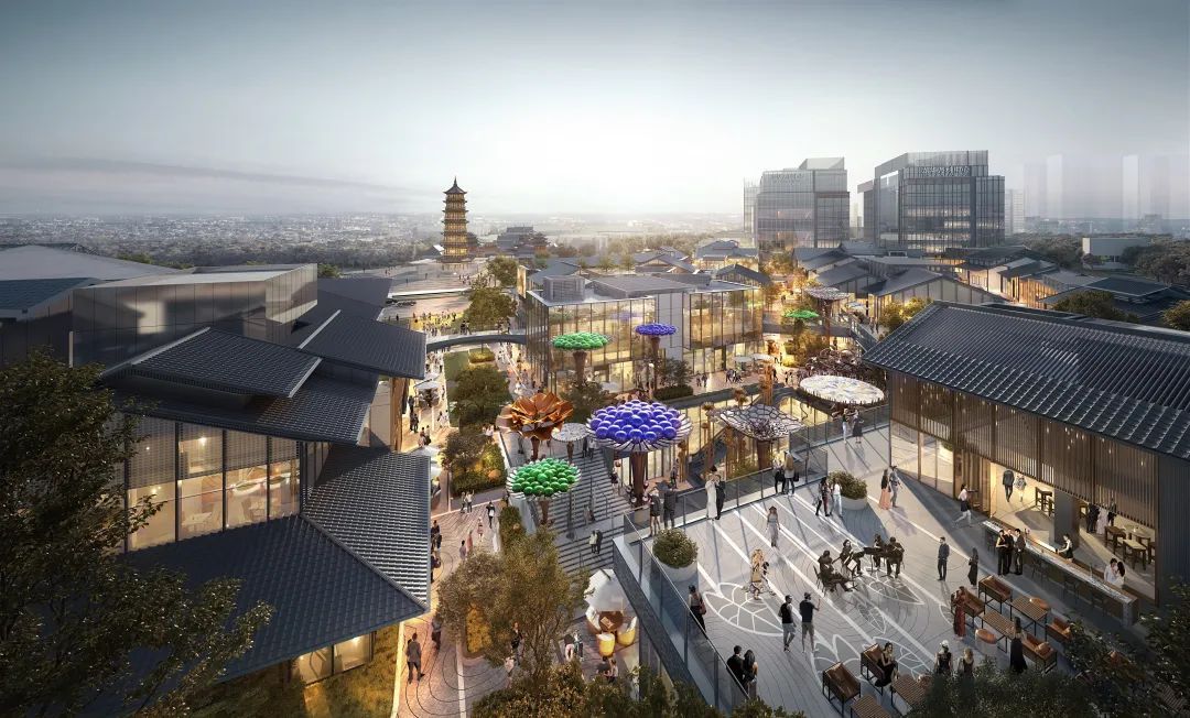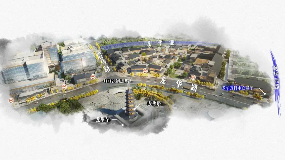 作为上海地区历史最久、规模最大的古刹,龙华寺是上海文脉、历史发源地之一。如今,沪上首座对望千年古刹的商业街区正在崛起。从龙华寺门口望去,四周新生的街区呈轴心放射状分布,重檐坡顶与玻璃石材立面搭配传统建筑形制,处处彰显出古今对话的张力。