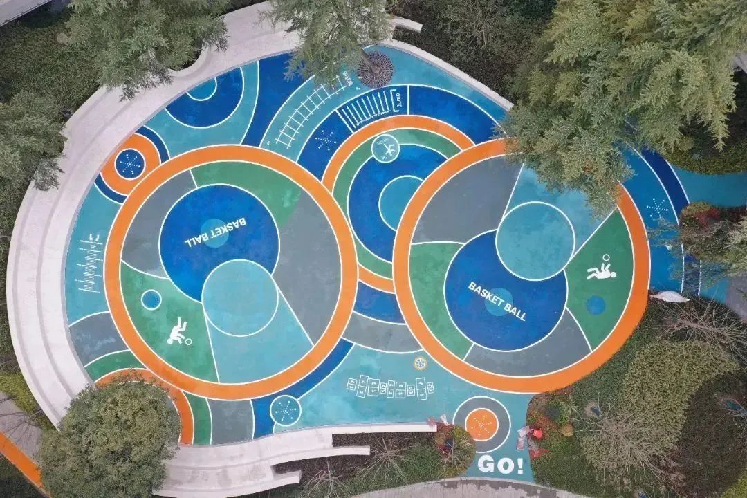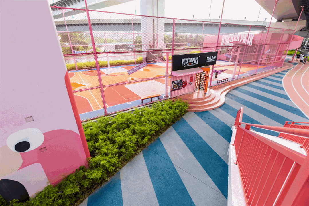 此外,还有一个活力四射的洛克公园,时尚篮球场配备8个篮球架、休息椅凳、自动贩售机等功能性设施,橘红、粉色等鲜亮颜色使整个运动空间充满活力气息。