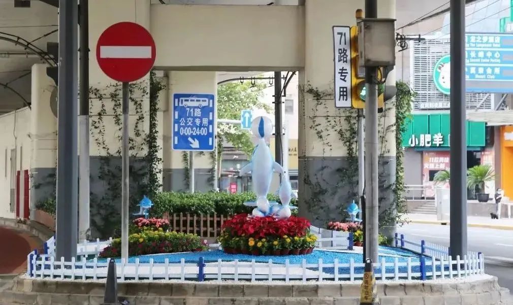 项目以“生态人文”为设计理念,铺设蓝色陶粒寓意海洋,白色陶粒寓意沙滩,其间粉色的杜鹃、金黄的非洲菊和百日草、吊牵牛花等花卉托起了一只只跳跃的海豚,象征着人与海洋和谐共生的环保理念。