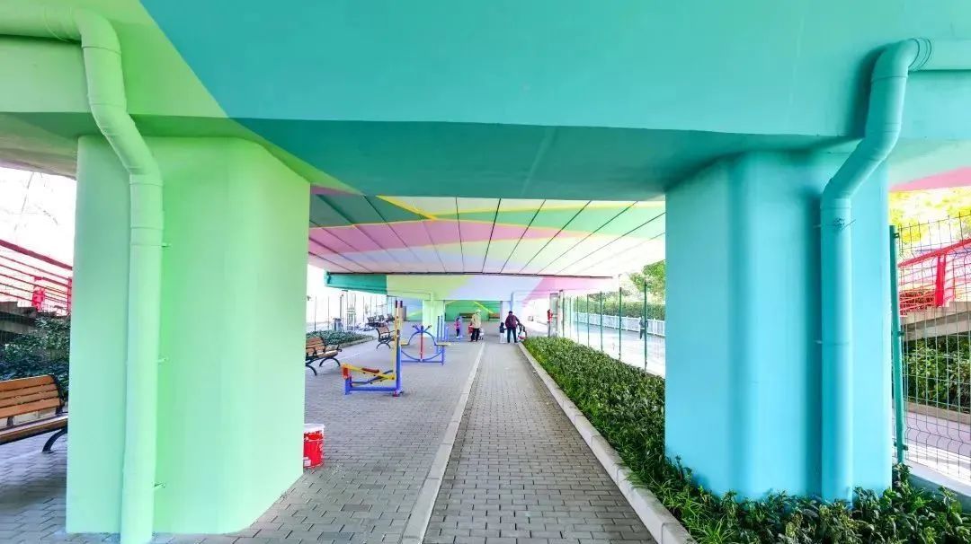彩虹人行桥、毛毛虫滑梯、小象造型的洗手池、集装箱改造的亲子驿站……这些改造为高架桥下空间增添了几分活泼。