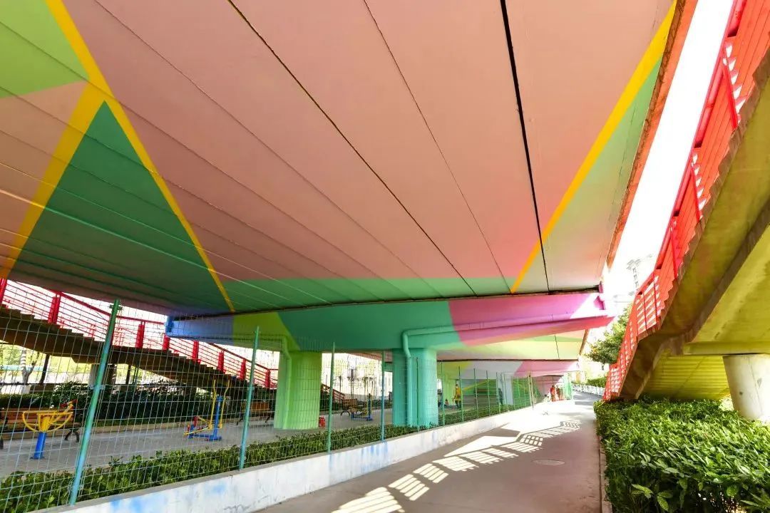 桥下空间是城市公共空间的重要组成部分,却也是常常被“遗忘”的地方,成为城市“灰色空间”。原来灰色的水泥地面和墙面,抹上了多彩的新貌,令人心旷神怡眼前一亮。