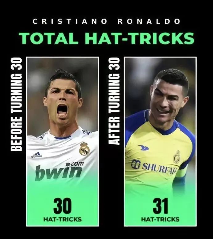 C罗在50分钟时间里打入4球上演大四喜的同时,个人联赛总进球数也达到了500球。据统计,C罗职业生涯61次上演帽子戏法,30岁前30次,30岁后31次!另外C罗职业生涯共11场比赛上演大四喜,其中皇马8场,葡萄牙国家队2场,利雅得胜利1场!