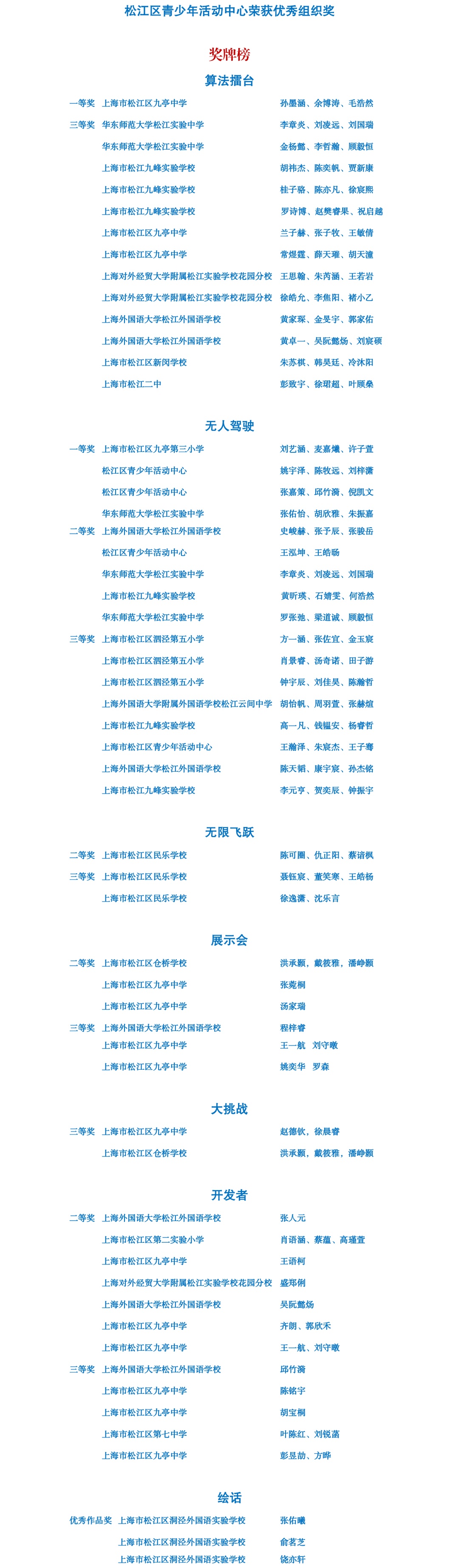 松江区参赛学校、学生在区青少年活动中心的组织带领下,参赛率和获奖率在众多省市区中脱颖而出,成功跻身一流梯队。本次比赛设置主赛道和嘉年华两大竞赛板块共7大挑战项目,松江区学生获得一等奖 5项、二等奖 16项、三等奖 33 项、优秀作品奖 3项;松江区青少年活动中心荣获优秀组织奖。获奖结果于近期公布,获奖情况如下: