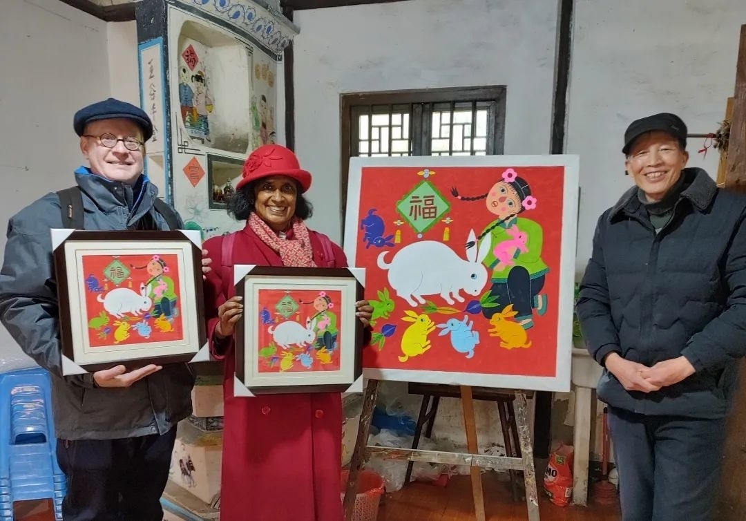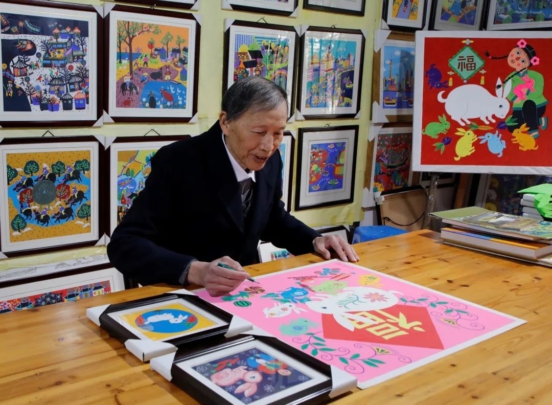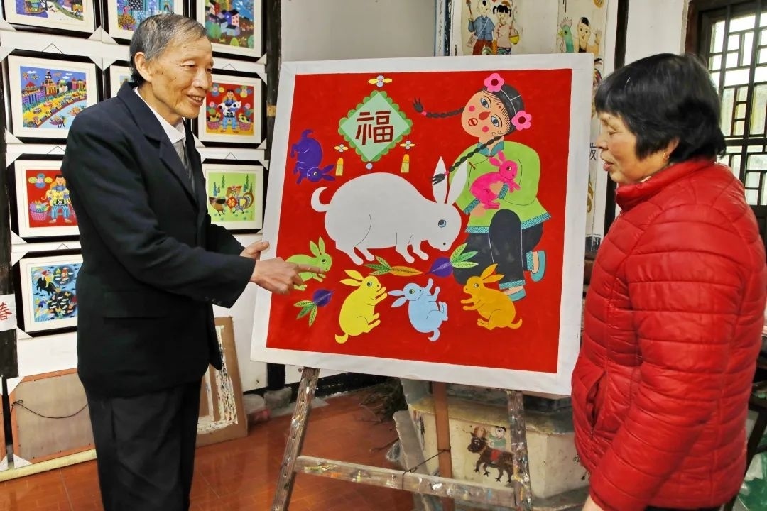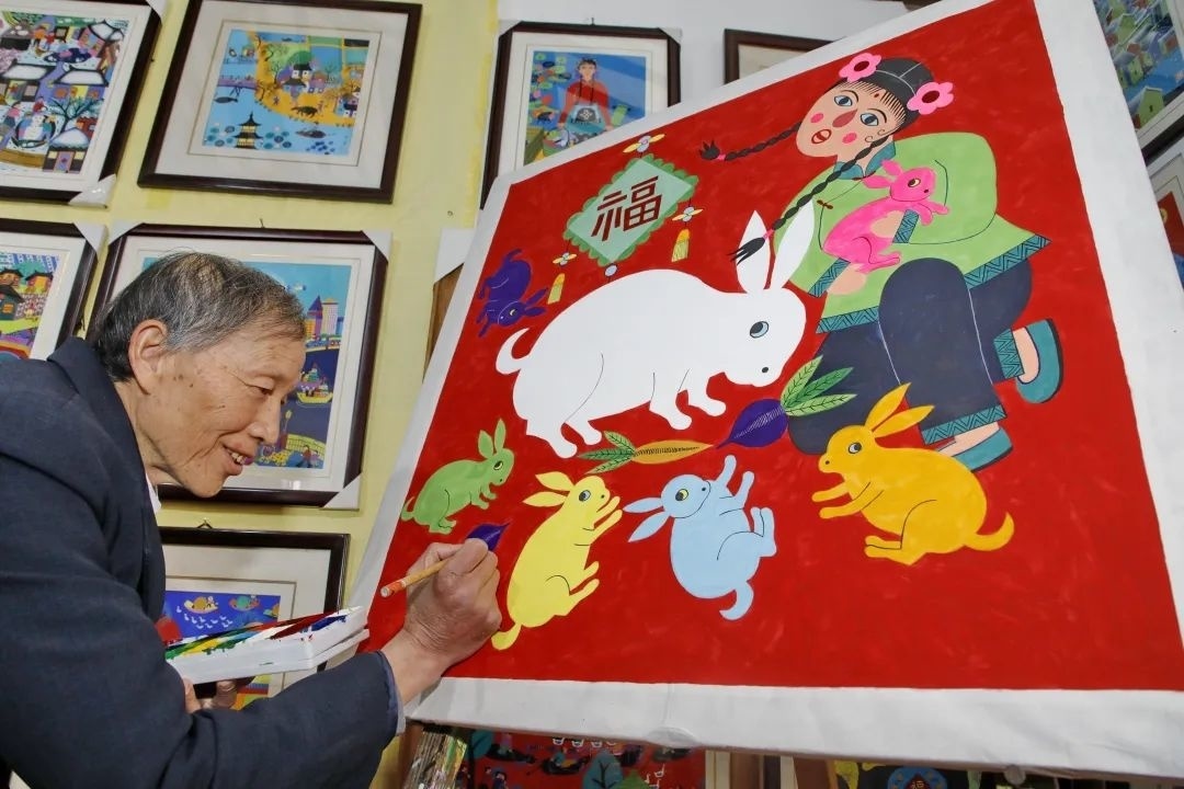 在中国农民画村,陈卫雄向记者展示了他绘制的兔年大作《福兔迎春》。图中一只大白兔占据了主要位置,白兔的周围还围绕着六只不同颜色的小兔。同时画中还有一名孩童,手中抱着一只小兔子,象征着人与自然和谐相处。