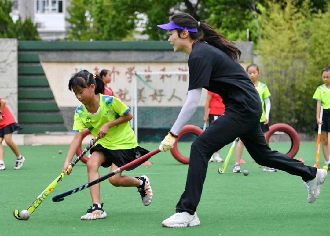 2022年8月16日,江苏省常州市武进区芙蓉中心小学曲棍球教练虞雅然(右)在指导学生陆诗琪训练。新华社发(史康 摄)