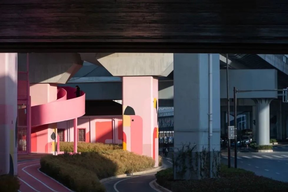在长宁区苏州河畔、北翟路高架下,全新的火烈鸟公园与周边的环境形成了鲜明的对比,很难不让人眼前一亮。桥下的整体色彩选用明亮而富有想象力的粉色系,呼应了火烈鸟主题,打破原本场地给人带来的灰暗印象,让中环桥下空间的形象焕然一新。