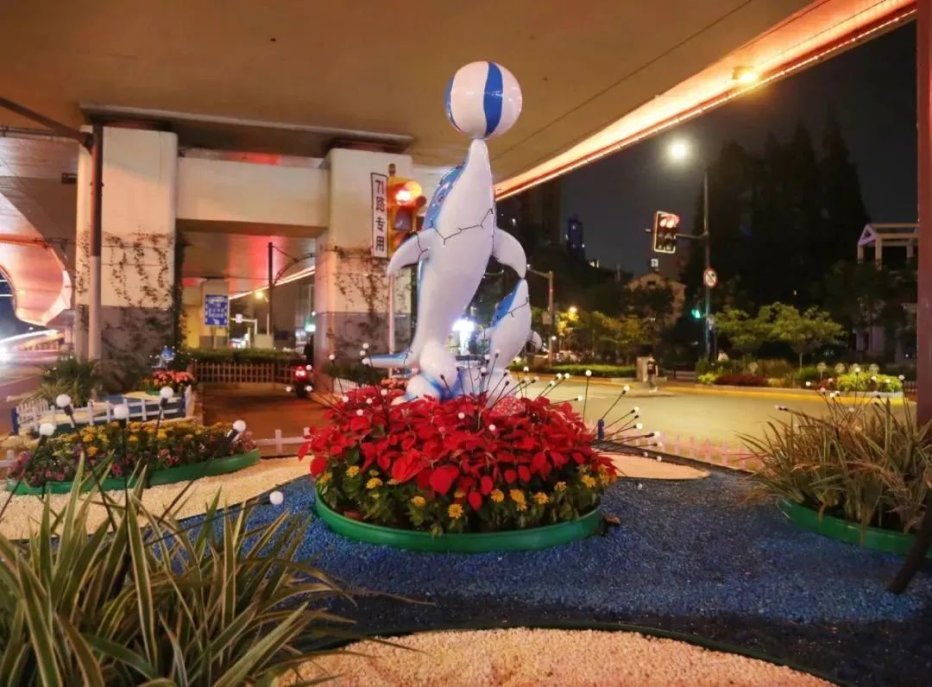 项目以“生态人文”为设计理念,铺设蓝色陶粒寓意海洋,白色陶粒寓意沙滩,其间粉色的杜鹃、金黄的非洲菊和百日草、吊牵牛花等花卉托起了一只只跳跃的海豚,象征着人与海洋和谐共生的环保理念。
