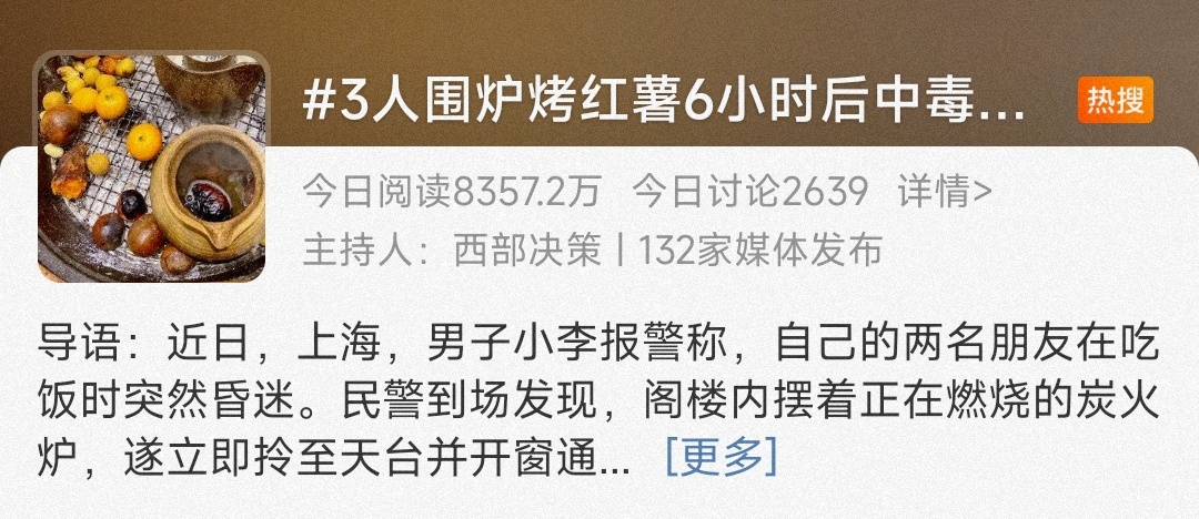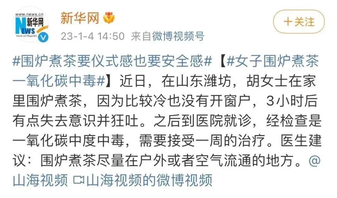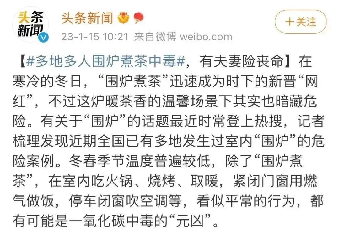 无论是网红休闲方式也好,盲目跟风也好,围炉煮茶已造成多地多起意外伤亡事件——一氧化碳中毒。