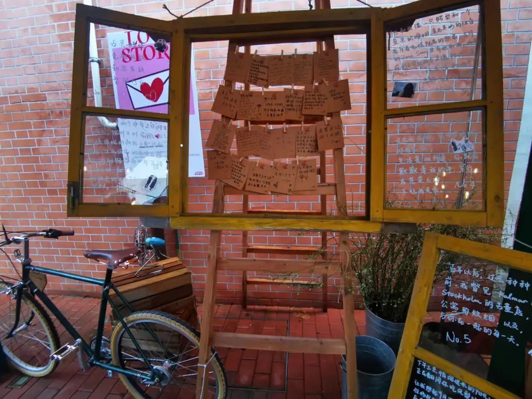 悬挂“爱情故事”的木扶梯、老窗框是古月市集主理人花青的收藏,他是隔壁慎成里的老居民,这片街区正是他从小生活的地方。