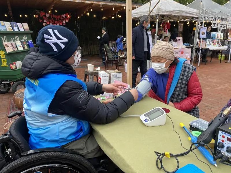 市集最中心的摊位,是深受老百姓欢迎的公益摊位——天平路街道配送的便民服务,涵盖小家电维修、量血压、测血糖、手机贴膜、衣服缝补等,一经口口相传,前来体验的居民络绎不绝。
