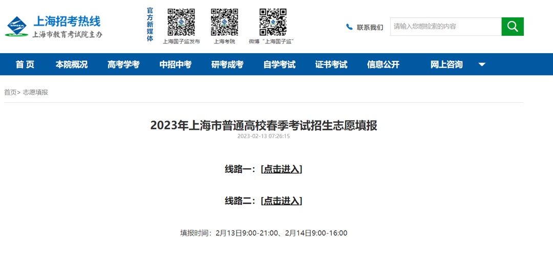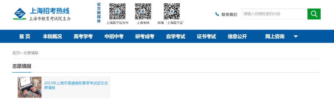 1.登录上海市教育考试院“上海招考热线”网站(www.shmeea.edu.cn),点击首页下方“志愿填报”栏目,进入“2023年上海市普通高校春季考试招生志愿填报”。