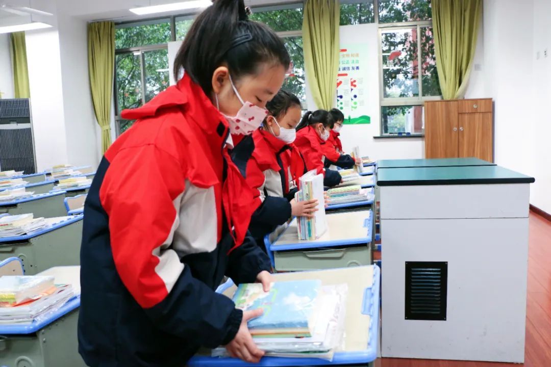 师生们共同期盼着线下“重逢”。部分学生代表早早来到校园,为开学典礼做准备;记者走进五年级四班的教室,看到课桌上整齐有序地摆放着新教材;再来到教师办公室门口,望见老师们都在认真备课,为开学做准备。