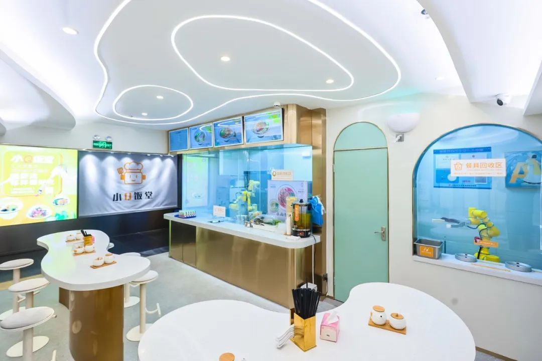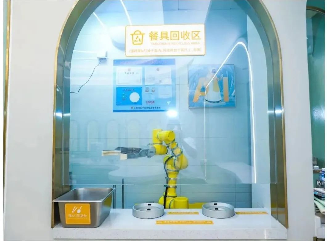 而店内的另一台机械臂,则忙碌在“餐具回收区”。白领在享用完面之后,将餐具放入餐品回收区的指定位置,机械臂会自动将碗中残留倒至湿垃圾箱内,完成垃圾分类。