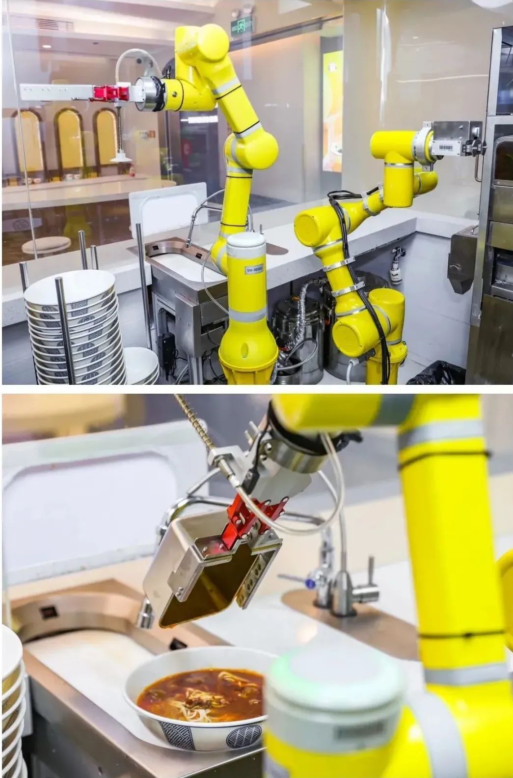 烹饪间里,只见两只机械臂飞快、熟练地扭动着腰身,有条不紊地相互配合。面条是从小麦粉和矿泉水和面开始现制,机器自动压制出面条只需要8至10秒,然后机械臂会将面条送入汤篓煮熟。