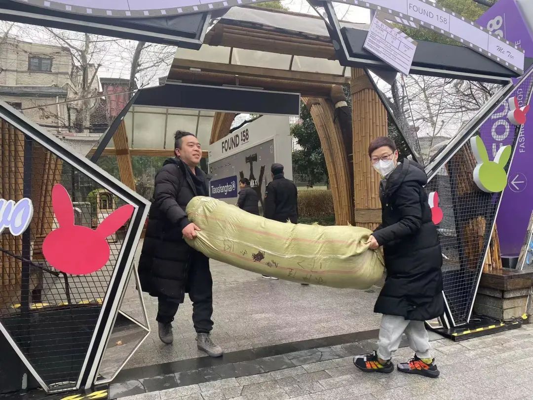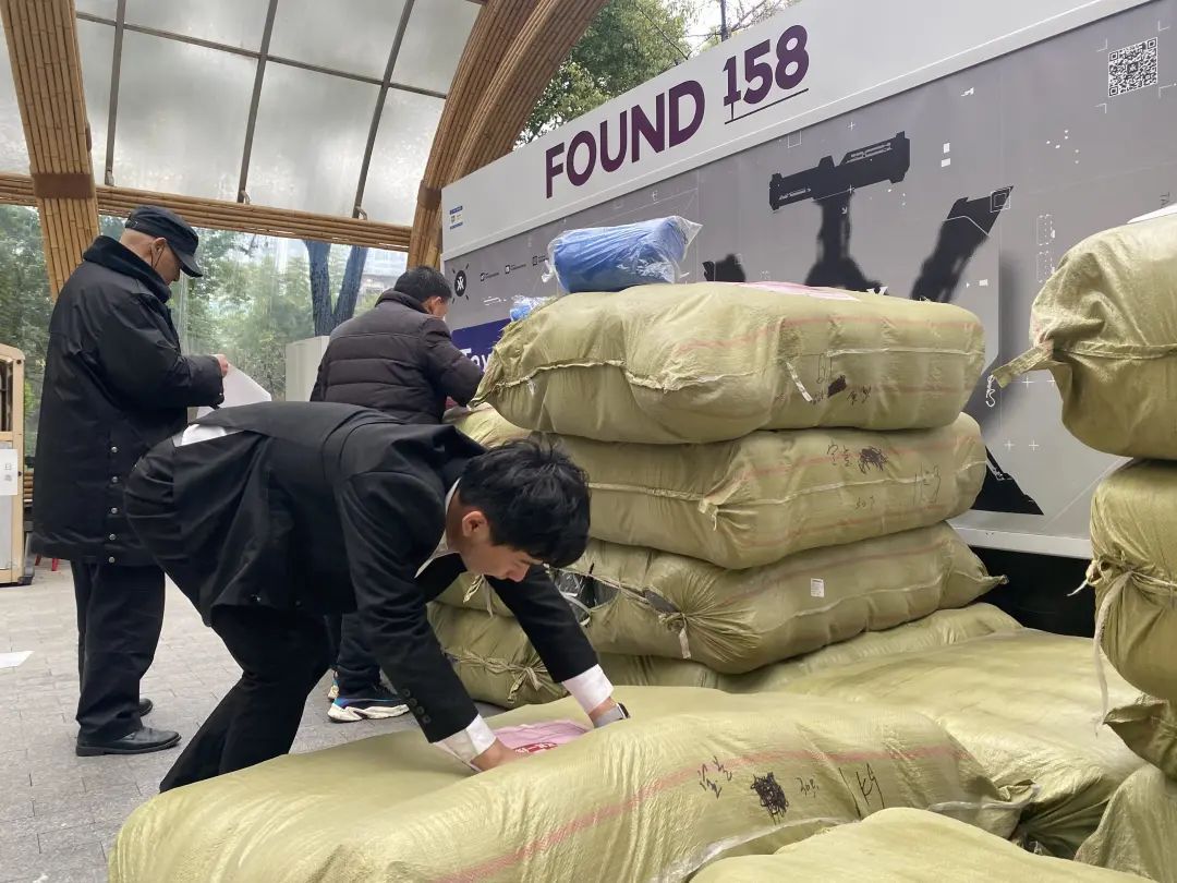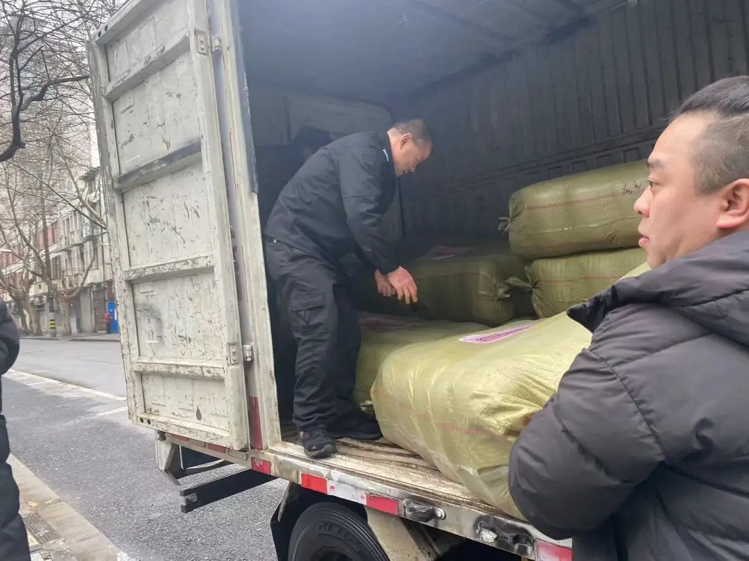 昨天中午,记者在FOUND158门口看到,成堆的睡袋已经用麻袋装好,工作人员将其有序摆放,并用中英文标注,贴着“有爱无疆”的标识。随后,运送物资的货车依约前来,工作人员再逐一将睡袋搬上货车,随机发往运送仓库。