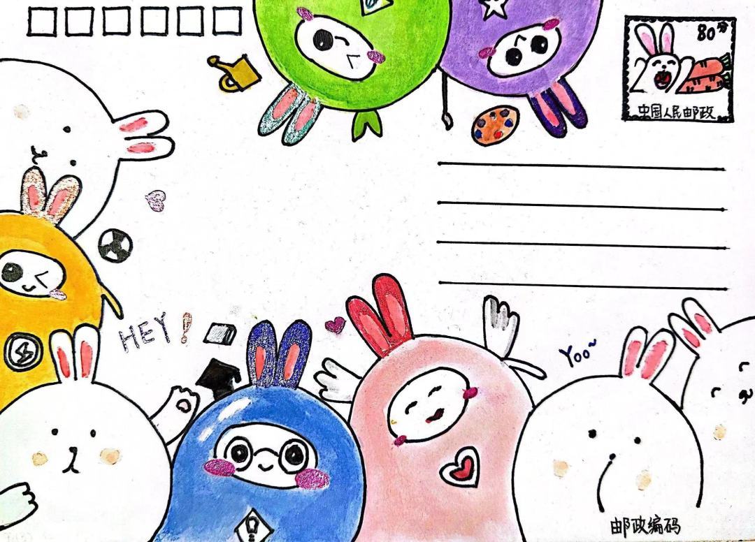 上海交通大学附属黄浦实验小学学生的美术作业——制作兔年明信片。