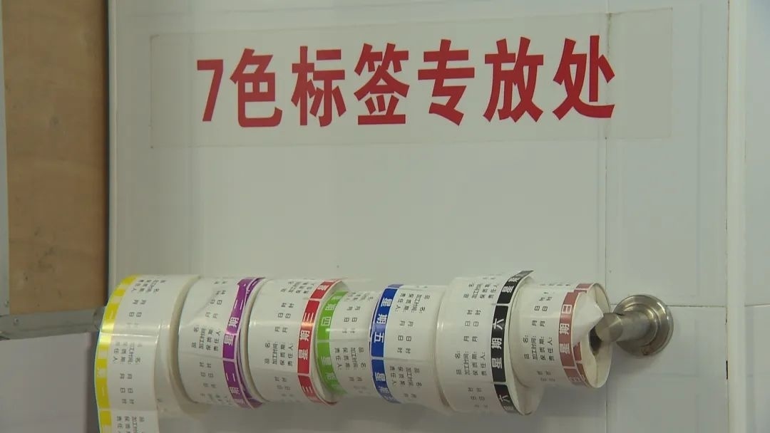 值得一提的是,该校食堂后厨内的“7色标签专放处”格外引人注目。工作人员告诉记者,“7色标签”主要针对生食品和半成品,标签上注明品名、加工时间、保质期等信息。
