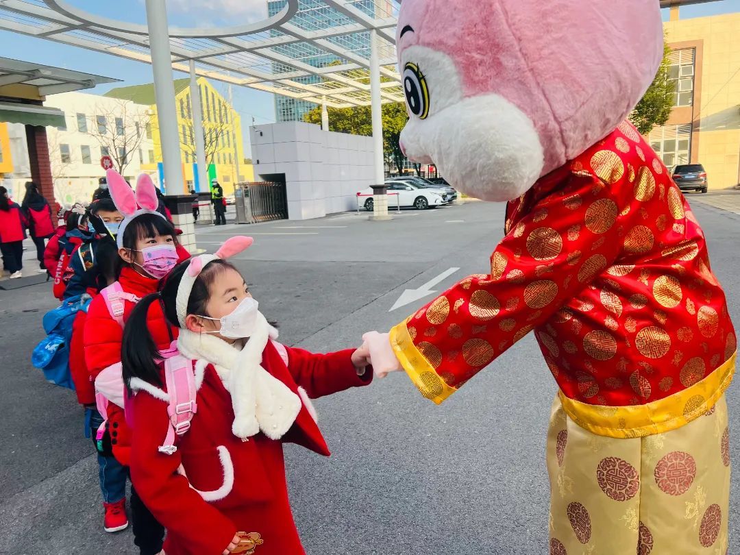 开学第一天,华师大附属宝山宝杨实验学校里处处有惊喜。刚踏进校门,学生就和迎面而来的兔子人偶击掌拥抱,还收到老师精心准备的“八字全福”校训红包。走过大展宏“兔”的造型门,回归校园的喜悦感扑面而来。