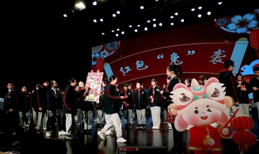 开学日清晨,两只印有实验元素的“活力兔”出现在上海市实验学校的校园里。它们怀抱红色幸运箱,为师生送上新学期的第一份惊喜。开学典礼上,红包“兔”袭环节点燃全场,第六季贺岁大片《兔子舞》首次亮相,引发师生热烈喝彩。