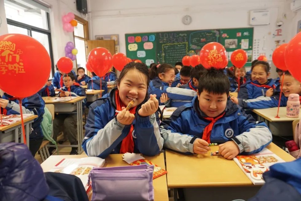在上海东南海岸的南汇嘴观海公园,浦东新区明珠临港小学的同学们一同守候,迎来了新学期的第一轮新日。他们沐浴着朝霞,打起了“八段锦”,寄寓新学期有一个健康的体魄。走进校园,更多惊喜带来满满仪式感:抽取“健康祝福券”、跳一跳摸摸新年成长门、手持“情绪易拉罐”定格新学期第一天的笑容……该校一、二年级的学生还连线参加上海历史博物馆的“开学第一课”,并以《明临新年,我“创”想》为主题开展项目化学习活动。